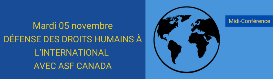 Tu t’intéresses à la défense des droits humains et au travail juridique à l’international ? Marie-Hélène Janvier, conseillère à la mobilisation internationale des talents, et Daniel Crespo Villarreal, conseiller juridique, tous deux d’Avocats sans frontières Canada, présenteront leur parcours professionnel menant jusqu’à leur poste actuel et le travail concret de défense des droits humains dans divers pays. Une occasion unique de découvrir les défis et les réalités d’une organisation engagée sur la scène internationale !